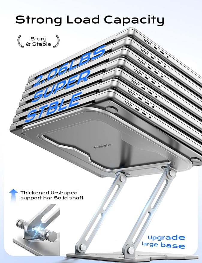- 【Stable & Reliable】-This laptop stand is made of robust metal, which makes it super sturdy and support max weight 17.6lbs/8kg; Equipped with our factory's unique alloy shaft technology, which has been tested more than 100000+ times, it is more flexible and durable than ordinary metal laptop stands, definitely good office laptop desk stand.