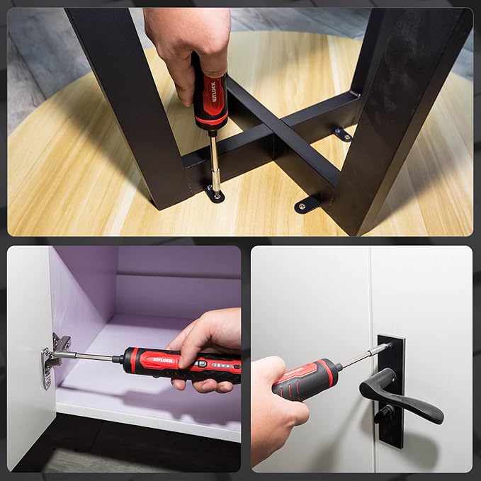 - 【Compact For Wide Applications】The Humanized design KITLUCK cordless screwdriver has the size of a manual screwdriver and comfortable rubber handle. Its compact, light-weight, portable and durable features make this mini electric screwdriver ideal for easy carrying and storage everywhere, perfect tool for electrical repair, light furniture assembly, switch installation, DIY projects, bicycle repair, electrical maintenance, etc.
