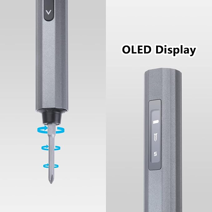 - 1.The electronic screwdriver set is equipped with innovative OLED screen design, allows you to see everything you need at a glance. There’s also real-time information, including screw direction, torque, and battery indicator bar, you’ll always know the exact setting.