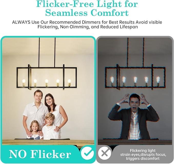 - Flicker-Free Design: Our E26 Edison 60W Frosted Globe LED bulbs are designed to be compatible with a wide range of dimmer switches. Refer to our recommended dimmer list to minimize flickering and achieve smooth, consistent lighting performance