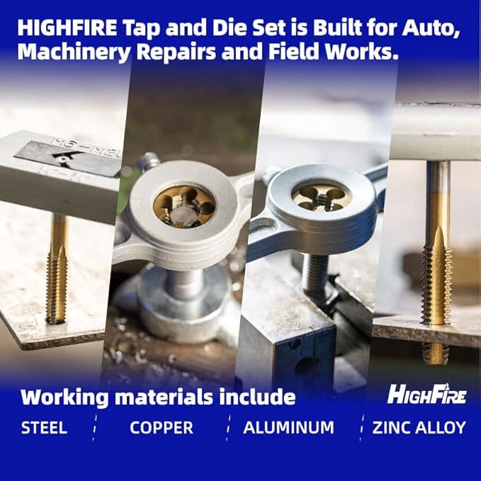 - APPLICATION - Suitable for creating new threads and repairing internal and external threads on most metals like steel, iron, aluminum, brass and copper. Ideal for cutting fasteners' thread for automotive, machinery repair, and field work. Perfect tap and die set for professional craftsmen and maintenance technicians.