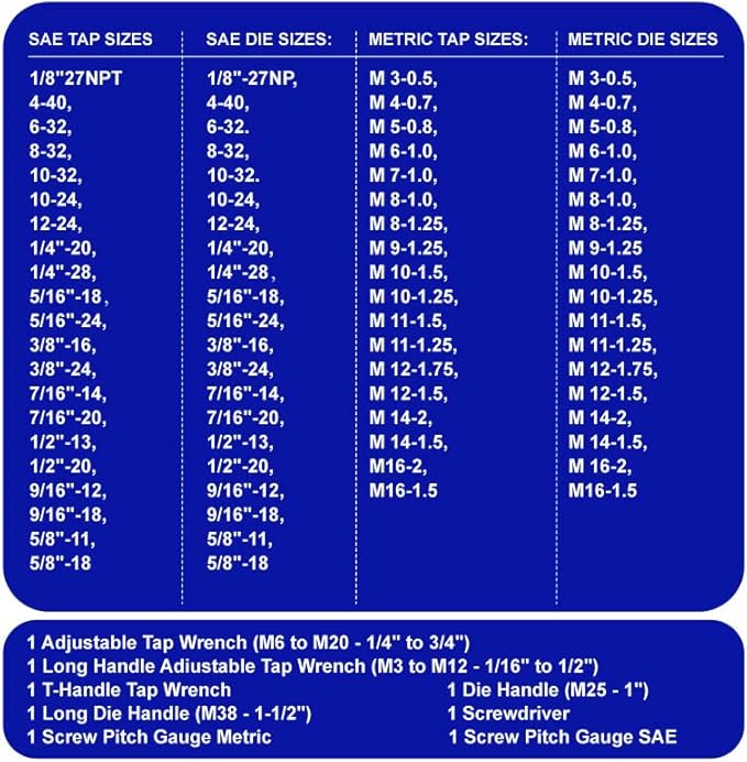 - 86 PCS TAP & DIE SET SIZES - Includes 39 taps (metric and SAE), 39 dies (in metric & SAE), adjustable tap wrench, adjustable die wrench, T-handle tap wrench, standard die wrench, metric & pitch gauge, iron rod, and screwdriver. The T-handle wrench secures taps to provide additional leverage for hand tapping ideal for confined spaces or where extra reach or leverage is required. T-handle tap wrenches may also be used with screw extractors, drills, and other tools.
