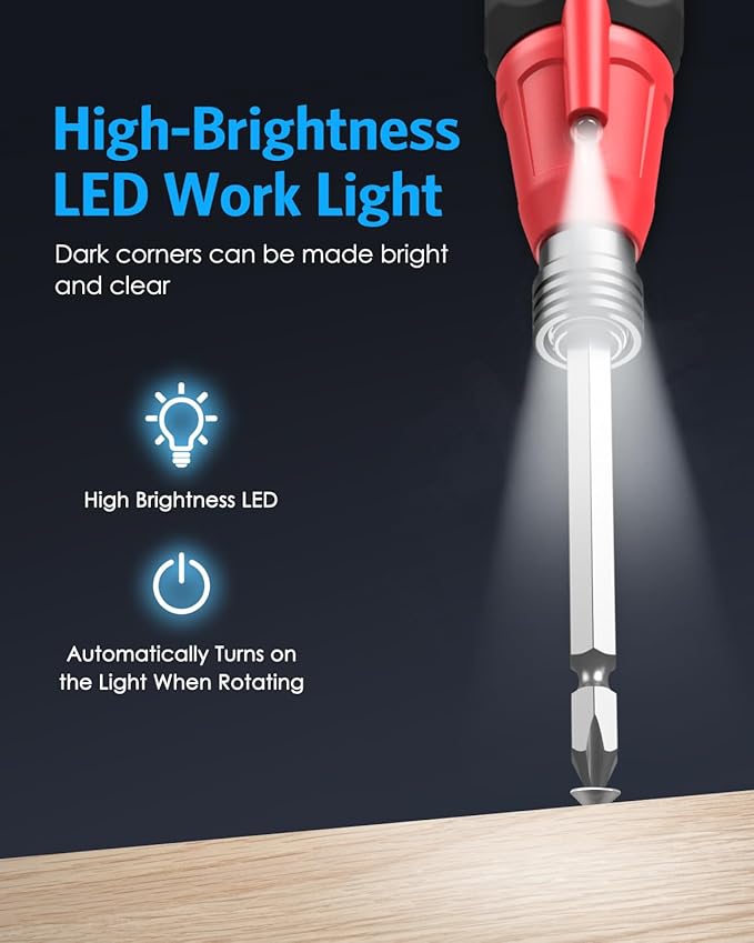 - Built-In Led Light and Usb Charging: The cordless screwdriver includes a built-in LED work light and rechargeable battery; The auto-on LED light illuminates small dark areas in corners; In addition, this cordless screwdriver supports USB charging; It can work continuously for 40 minutes after 1 hour of charging