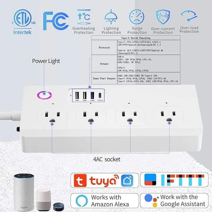 - 【Fast Charging Type C & Smart Outlets】Smart power strip with 4 Individually Controlled AC outlets and 3 USB ports(one USb 18W Fast Charger), One Type C(PD 20W) fast charger,supported for 8 appliances simultaneously. IT is suitable for home, office, specially suitable for fast charging smart phones, with a maximum withstand power of 3500W.