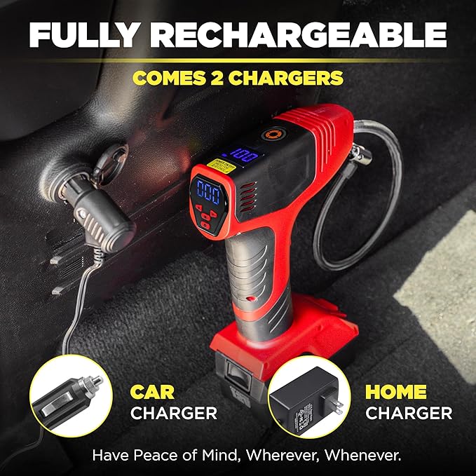 - NEVER GET STRANDED AGAIN - DUAL POWER SYSTEM - Includes 9.8ft DC cord for car use AND 3.3ft USB-C home charging cable. This electric battery powered air pump provides multiple tire inflations per charge - your portable pit crew is always ready.
