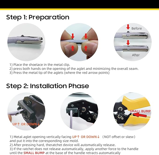 - Powerful function: metal aglets tool adopt adjustable pressure device and ratchet design, labor-saving and can lock the position, complete the automatic release after pressing. The non-slip handle feels comfortable.