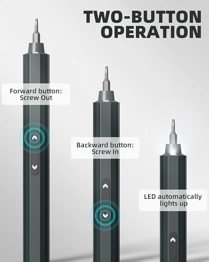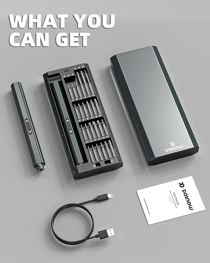 - 【What you get】1x Mini Electric Screwdriver, 48x Precision Bits, 1x USB-C charging cable, 1x Storage Case, 1x User Manual. The electric magnetic screwdriver set comes in a portable case and weighs only 1.03 pounds, making it easy to carry. As a Christmas and anniversary gift for family and friends, it can help them work efficiently. We provide 100% after-sales service including 2-year warranty and replacement.