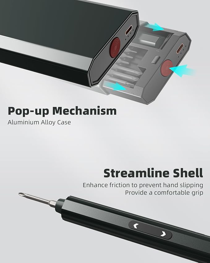 - 【Magnetic Case Design】The magnetic case stores the mini electric screwdriver set and 48 metal bits neatly, so you don’t have to worry about parts falling and losing. The pop-up mechanism allows you to open and close the case easily. Both the chuck and bits are magnetic and easy to install. You can also use the magnetized area on the bottom of the case to magnetize bits and secure screws.