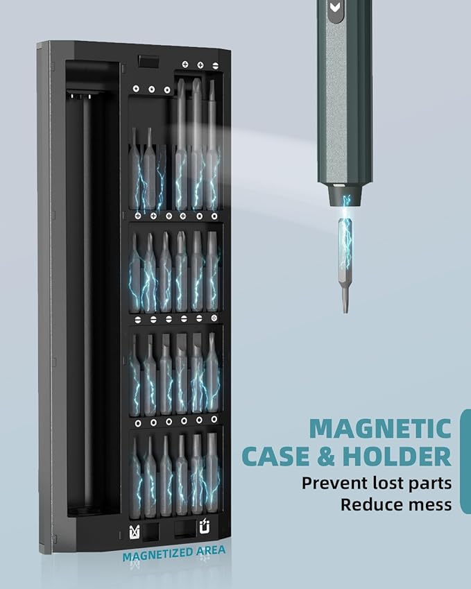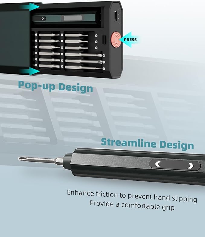 - 【Innovative Pop-Up Magnetic Storage Box】This electric screwdriver set includes a convenient pop-up magnetic storage box that opens and closes effortlessly, providing easy access to your tools. The innovative magnetic drill bit design ensures that the internal screwdriver bits remain securely in place, even if the box is turned upside down. Additionally, the tool box features both magnetization and demagnetization zones specifically designed for the drill bits, ensuring that your tools maintain their precision and performance.