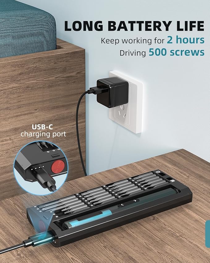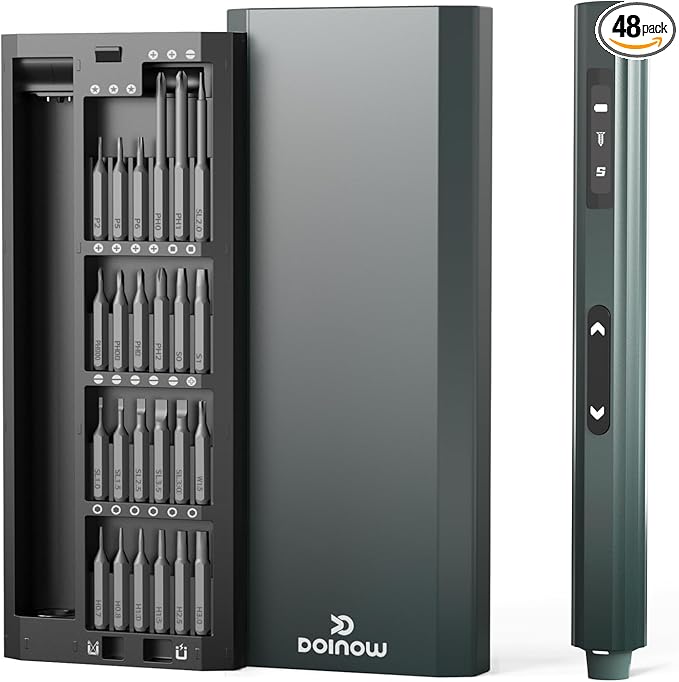 - 【Durable, Comprehensive Tool Kit】This mini electric precision screwdriver set includes 12 types of 48 magnetic steel bits, designed to fulfill a wide range of needs. Crafted from wear-resistant, hard S2 material, these bits resist deformation and maintain precision over time. On a single charge, the electric screwdriver can operate continuously for 2-3 hours and tighten up to 500 screws.