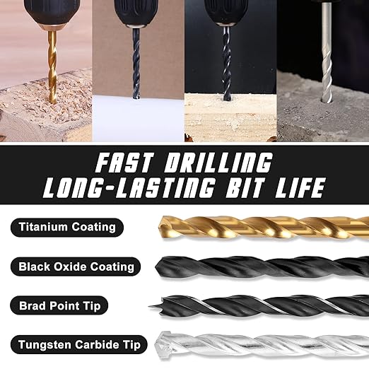 - 【CAPABILITY & DURABILITY】- Drill bits and screwdriver bits are made from superior HSS material for improved strength and durability. And the titanium finish and black oxide coating help the bits deliver higher drilling performance on wood and metal. Whether you are a mechanic or a DIY enthusiast, this drill bits combo kit will assist you in every application.