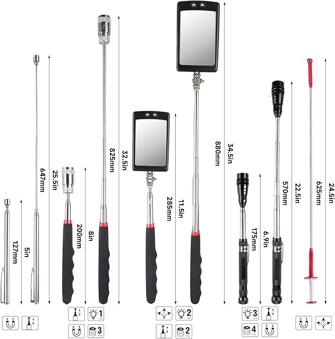 - Professional 5-Piece Telescoping Magnetic Pickup Tool Kit : Our complete set features a 10lb telescoping magnetic pickup tool with LED, 1lb telescoping magnet, 360° inspection mirror with dual LEDs, flexible flashlight, and ergonomic grabber. Perfect for retrieving metal parts in confined spaces.