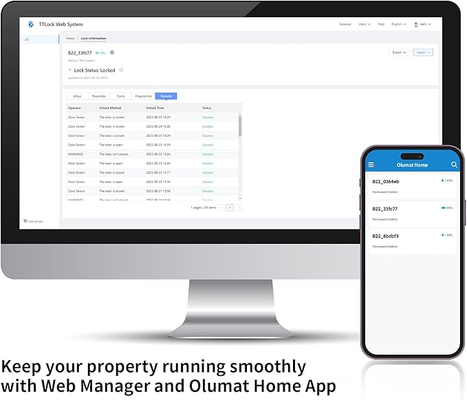 - Remote Control: If paired with Olumat WiFi Gateway (Optional Add-on, Sold Separately), you can lock/unlock your smart door lock anytime anywhere, set up passcodes remotely and check real-time access logs, and voice control with Alexa