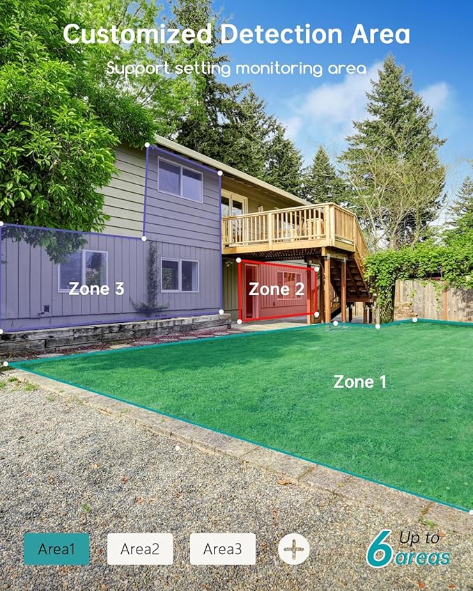 - Custom Mode & AI Analysis & Real-time Alerts: Customize alarm schedules, detection areas, and intervals with outdoor security cameras wireless. The combination of PIR and AI algorithms accurately identifies people, pets, vehicles, and parcels, offering the "human detection only" function at no additional charge. Adjust sensitivity levels from 1 to 10 for higher accuracy and fewer false alerts, minimizing the inconvenience of frequent notifications