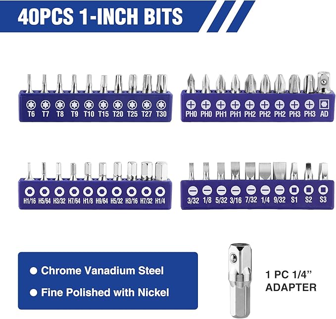 - Well Organization & Easy Pick :The screwdriver bit and nut drivers set comes with a reinforced 1680D Bag. Distinctive model mark on the product. Save your time to make your project more efficient.