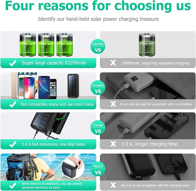 - 【Solar Panel Perfect for Outdoor Enthusiasts】:63200mAh solar power bank super large capacity.Let you get rid of the anxiety about battery electricity anytime,anywhere. Built-in 4 LED flashlights with 3 modes (lighting/ flashing/ SOS), which can be used as camping lamp, emergency lamp and rescue signal lamp. Equipped with solar panel, just hang it on your backpack to get recharge via sunlight. It's perfect for outdoor activities, like camping, hiking and other emergencies.