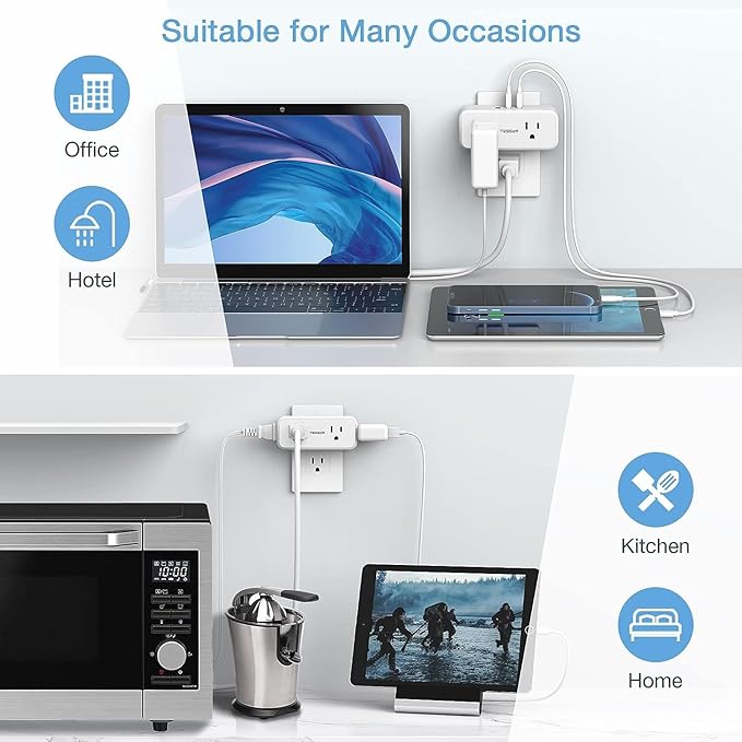 - Space Saving: This plug splitter occupies only a single outlet on your wall panel, put on the top outlet and you still have enough room to be used; 1 outlet can extender to 3 USB ports and 4 outlets, powering up to 7 devices at the same time