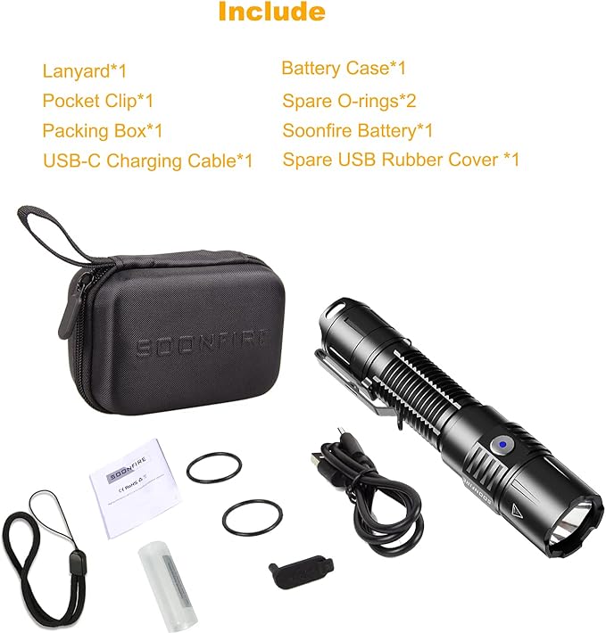 - STROBE READY: Quickly double-click switch to the high lumen mode at any time. Non-linear strobe patterns cause enhanced dizzying effects, highly effective for diffusing a tense situation.Soonfire flashlight is fun to play, Please reach us for guidance.
