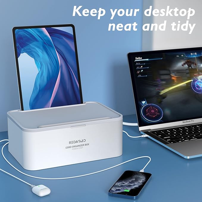 Power Strip with Cable Management Box, Redagod Surge Protector 8 Outlets and 3 USB Ports with Switch Control, 6.6 ft Flat Plug Extension Cord, Organizer Charging Station for Kitchen, Dorm, Office,Home