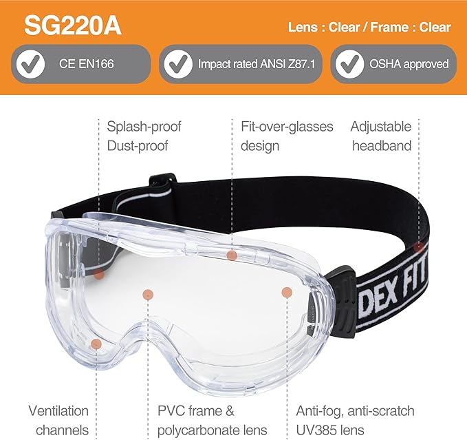 DEX FIT Protective Safety Goggles SG220A; OTG Over Glasses Fit, Anti Fog & Scratch, Z87 Eye Protection for Lab, Science, and Chemistry Work, Indirectly Vented, Adjustable for Women and Men