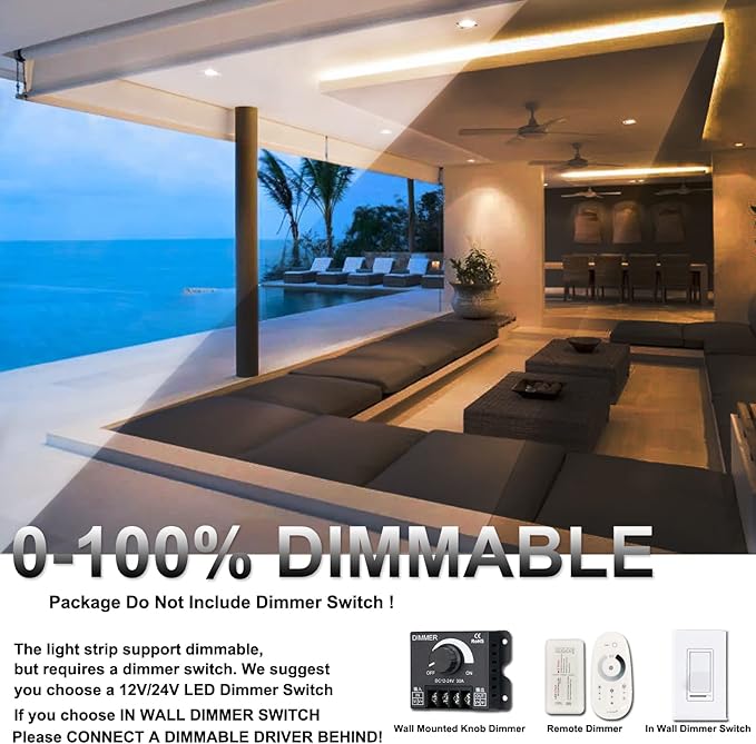 - 📌📌ATTENTION: ①24V power supply and dimmer not included;②High output light strip that the heat is higher than regular light strip, but still under safety range③Please use the correct power supply, otherwise the light strip will not work or be very dim.