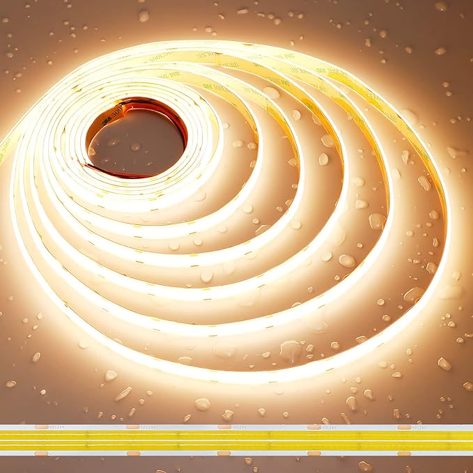 - [ Wider Illumination ]: Dual row COB led light strip 12MM width, equipped with two rows of high efficacy LEDs on one strip (960Chips/M), so that it produces a wide strip lighting,emits great light distribution with no lighting spots or dark areas.
