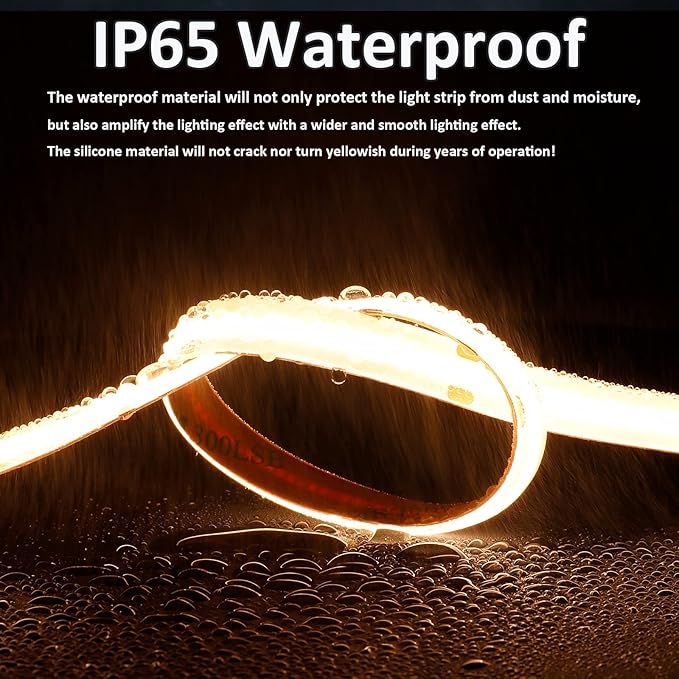 - [ IP65 Waterproof ]: Sealed with clear silicone glue which will not crack nor turn yellowish during years of operation. Also the lighting effect is wider and brigher than non waterproof light strip.