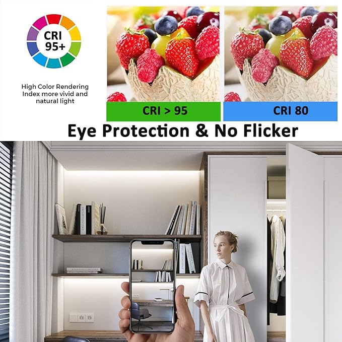 - [ High Color Render & Eye Protect ]: CRI >95, the higher CRI means the colors and textures of items illuminated are close to saturated and show the true, unmuted tones. Also the light strip won't flicker which will protect our eyes and reduce eye fatigue.
