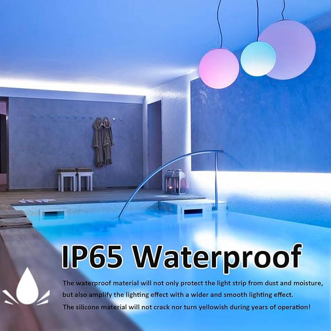 - [ IP65 Waterproof ]: Sealed with clear silicone glue which will not crack nor turn yellowish during years of operation. Also the lighting effect is wider and brigher than non waterproof light strip.