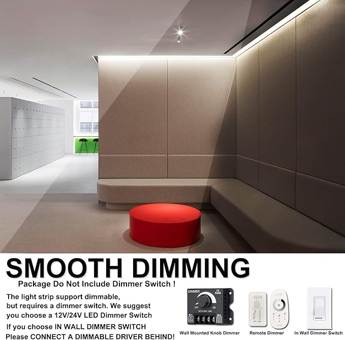 - ATTENTION: ①24V power supply and dimmer not included;②High output light strip that the heat is higher than regular light strip, but still under safety range③Please use the correct power supply, otherwise the light strip will not work or be very dim.