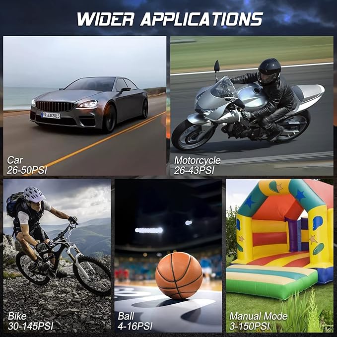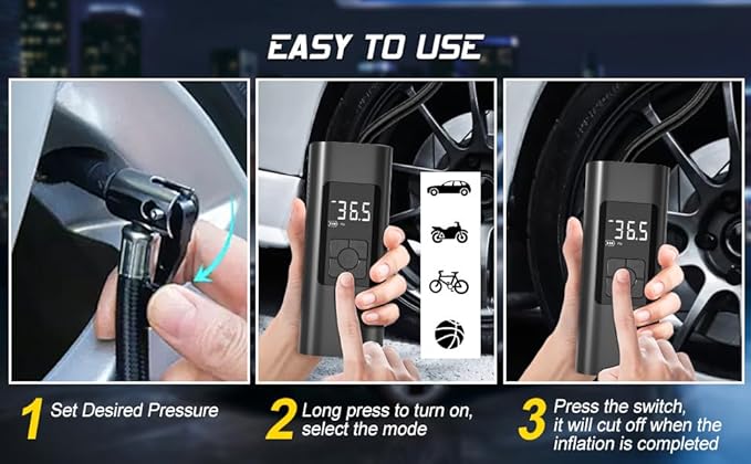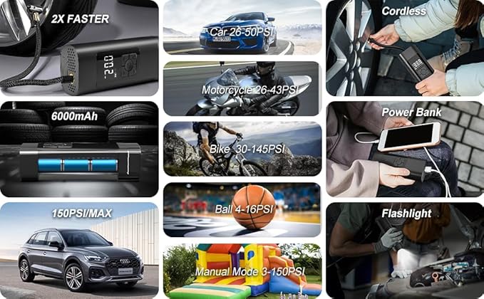 - Quick & Accurate: Built with the highest quality materials, GrJyls Car Tire Inflator is a portable tire inflator for car, trucks, SUVs, motorcycles, and bicycles. Quickly inflate your vehicle's tires in just minutes with precision accuracy up to 120 PSI. Small and compact car air pump that fits in your glove box or trunk.