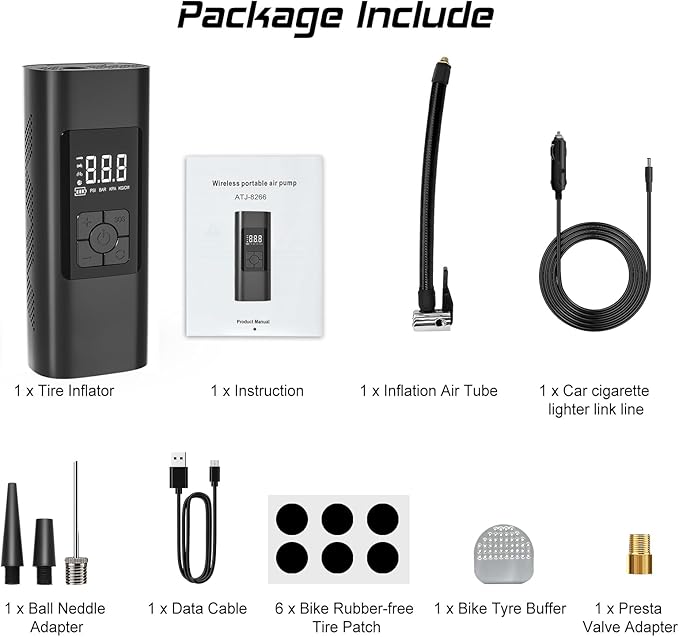 - Invest in Peace of Mind: Perfect gifts for women and gifts for men. Conveniently store this portable air compressor for car tires in your glove box or garage, ready for use whenever needed. The package comprises 1* GrJyls Car Tire Inflator, 1* Air Hose with Schrader attached, 1x General Nozzle Cone, 1* Needle Adapter, 1* USB-C Charging Cable ,1*Car Charger Cable 1* User Manual and 6 * bicycle rubber-free tire patch.