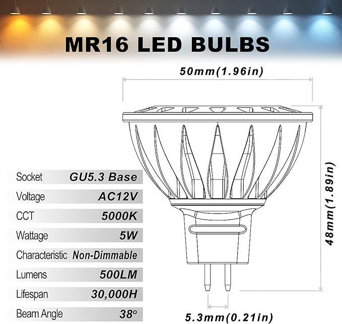 - Special Feature : Non Dimmable, mr16 5000k led bulbs daylight, 12v low voltage, replace 20w-50w halogen