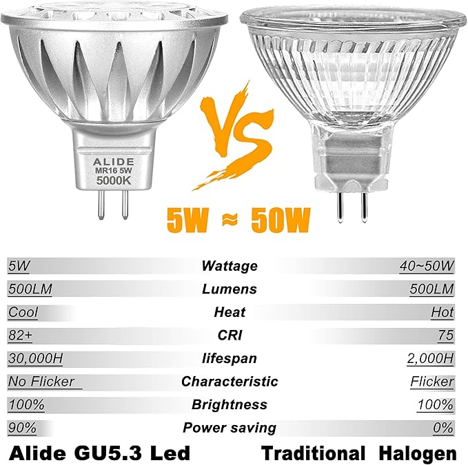 - Higher Brightness and Save Electricity Bill: MR16 5W 5000k led bulbs 500lm to replace mr16 50w halogen, save your electricity bill of lighting