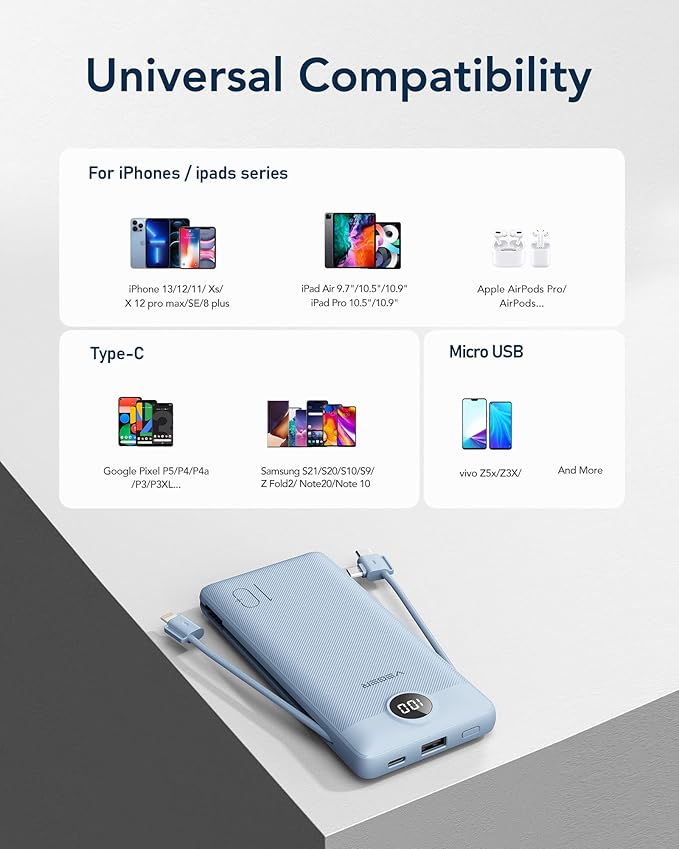 - 【Wide Compatibility】VEGER portable battery charger is widely compatible with All iPhone, iPad, Samsung, Google Pixel, tablets, just connected to your device with the cable built in and the external battery would fix with different devices to get fastest charging.