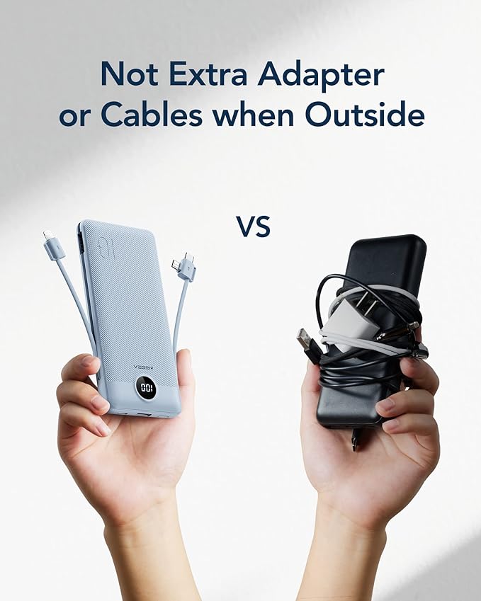 - 【Portable Charger for Multiple Devices】Designed for multiple devices, this portable charger features 4 outputs, including 2 cable outputs, USB-C, and USB-A outputs. Charge up to 4 devices simultaneously, and enjoy fast charging speeds of up to 15W with each cable and USB port output.