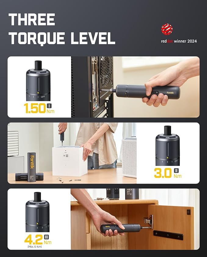 - Top-Notch Performance: The 220 RPM Magnastrom motor has 3 torque settings: 1.5,3 and 4.2N.m., a maximum hard torque of 6N.m, and an 8 N.m. manual torque. Stop right away if the finger rises; work efficiently not hard. This powerful electric screwdriver offers accurate torque pressures for your handy work needs. Ideal for assembling and fixing desktop computers, air conditioners, faucets, socket boards, and furniture, among other items