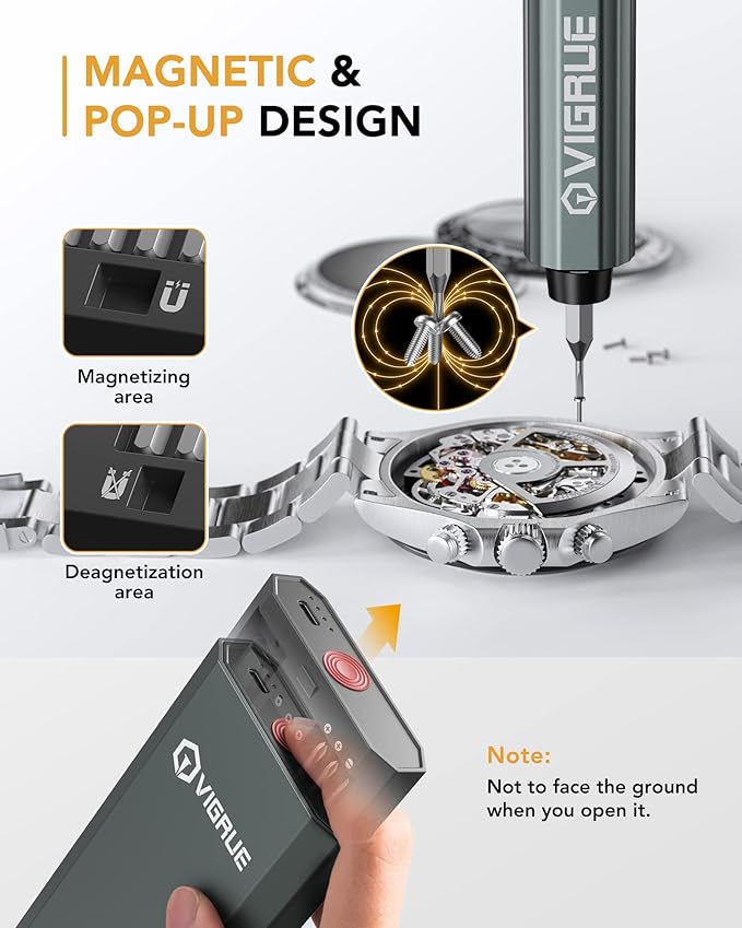 - ⚡【Magnetic Design & Dual Mode】The case of this VIGRUE mini electric screwdriver closes magnetically, and is loaded with a 48 bits ordered by size. With a magnetized area, the drill can be magnetized when it touches. Buttons for forward and reverse rotation of the power screwdriver are clearly marked. This dual-mode meets your requirement of tightening or loosening screw bits