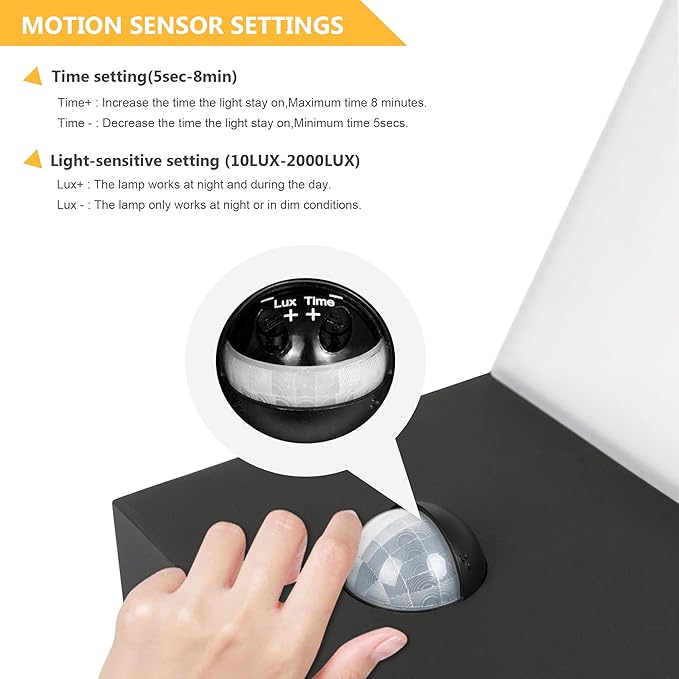 - PIR motion sensor:Automatically lights up when it detects someone passing by.Sensing distance: 5-8 m .Sensing angle: 120 degree.There are lux and time on the motion sensor that can be adjusted,you can set Lux---Brightness of surroundings when motion is detected and light is on (10lux-2000lux),Time-Lighting time after no motion detected(5s-600s)