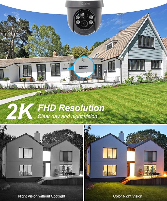 - 【3MP FHD Image, 360° Coverage】ANRAN Q01 outdoor security camera is equipped with 3MP Super HD image sensor and optical lens to provide better live HD video. In addition, this home security camera has a 355° horizontal and 90° vertical swivel range, so you can see every detail at a glance which providing all-round protection for your home.