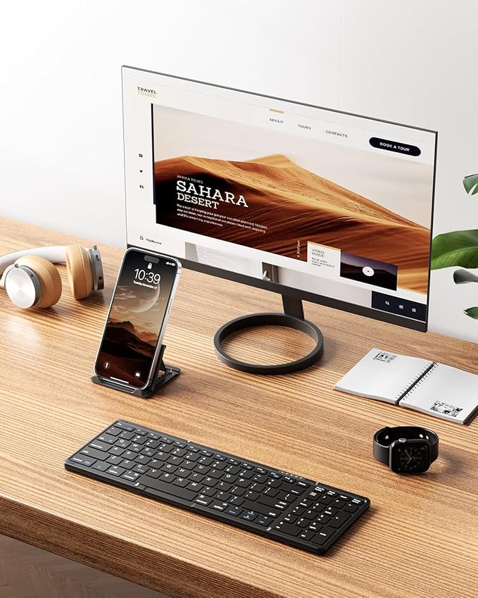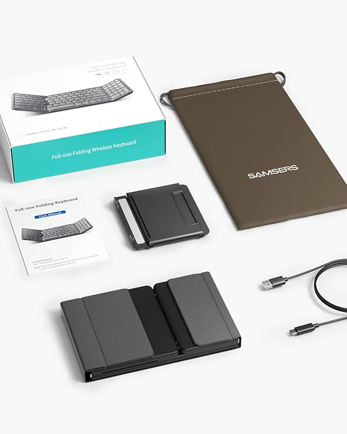 - 【Little Things & Big Convenience】 Samsers portable folding keyboard, only 9.3 ounces. Palm-sized keyboard can be folded up magnetically and put in your briefcase without taking up much space. Maximum convenience for you with minimum weight and size! Comes with a phone stand and a velvet storage bag, the perfect companion for a folding keyboard. Not just a keyboard, but a travel solution!