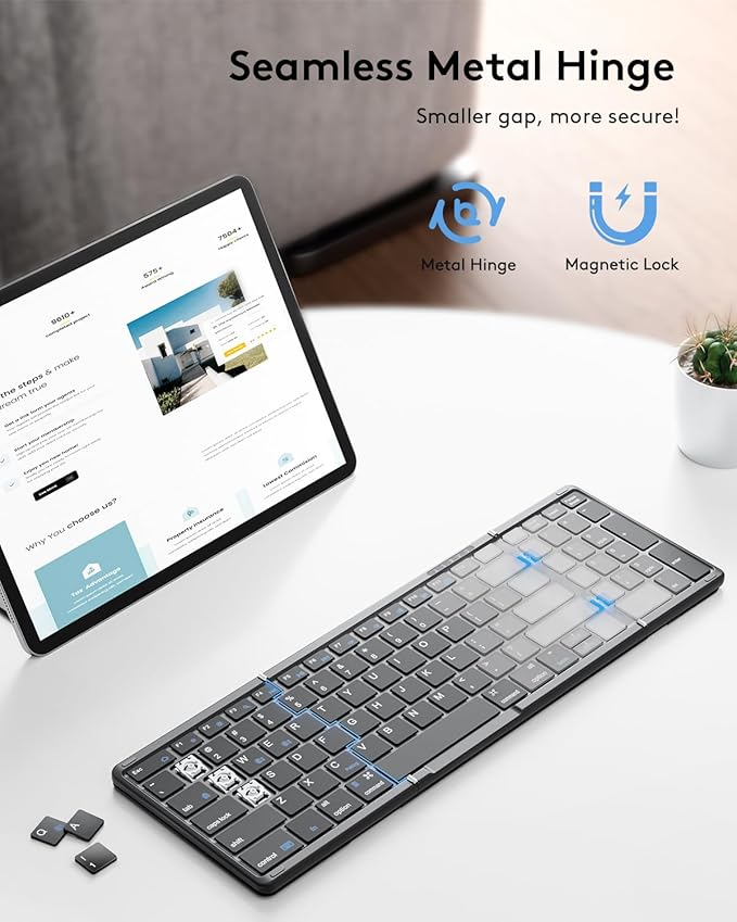 - 【Full-size Folding Wireless Keyboard】 Samsers foldable keyboard is designed with standard size (unfolded size: 13.5 x 4.5 inch) and 0.63 inch standard keys, more in line with finger size and typing habits. Innovative seamless metal hinge, allow you to adapt to its layout anytime and anywhere. Quiet scissor-switch keys and non-slip PU leather at the bottom, so that you can fully concentrate on your work!