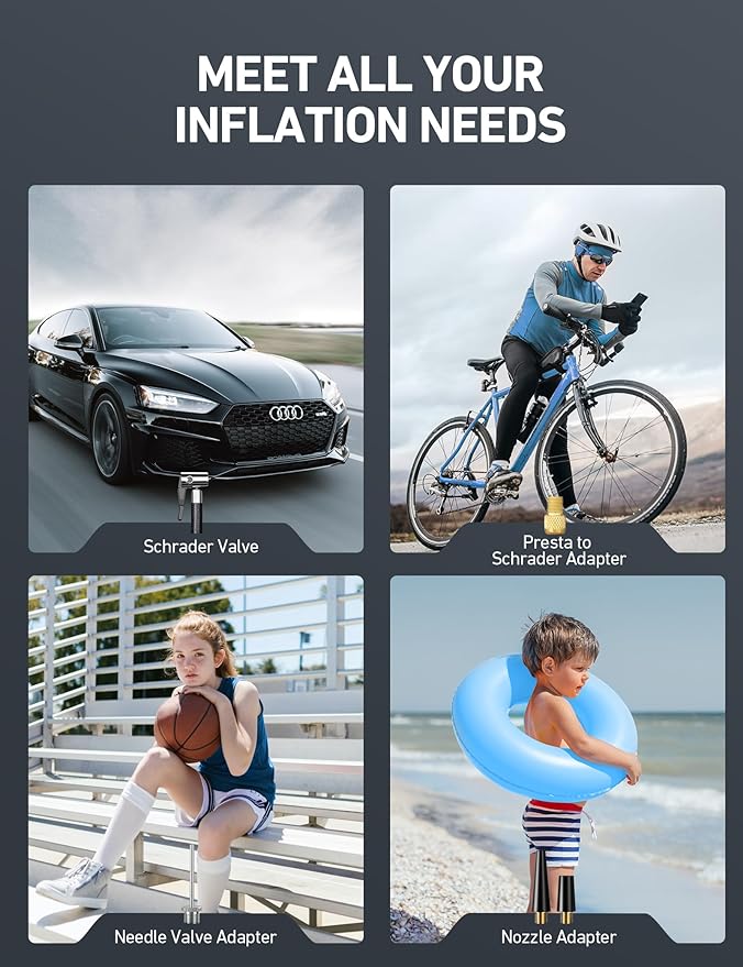- Full Accessory Kit for All Inflation Needs: The package includes: 1×AstroAI S1 Tire Inflator, 2×Nozzles, 1×Needle Valve Adapter, 1×Presta-Schrader Adapter, 1×Replacement Fuse, 1×User Manual. This tire inflator air compressor is universally compatible with cars, bicycles, basketballs, swimming rings, and more. If you have any questions or concerns, please feel free to contact us.