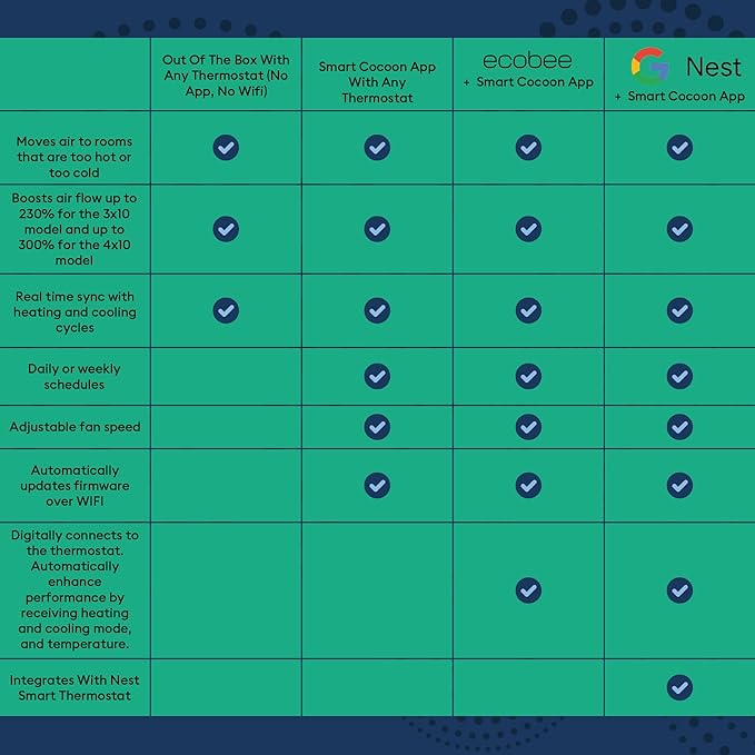 - WORKS WITH SMART AND CONVENTIONAL THERMOSTATS: SmartCocoon integrates directly with Ecobee and Nest smart thermostats to enhance your smart home heating/cooling system. Our intelligent booster fan also syncs with all other smart thermostat brands to optimize airflow and move air to other rooms.