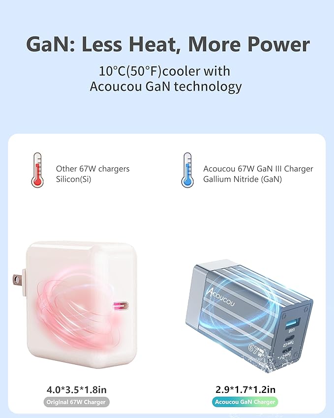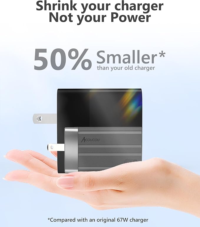 - 【Fast Charging】By utilizing the low heat generation and high efficiency of GaN III material, the Acoucou 67W/65W super fast charger can enhance charging efficiency to 90%, leading to an incredibly fast charging experience. Starting now,the iPhone 13 Pro Max charging speed is three times quicker than the original 5W charger. Additionally, charging the 13-inch MacBook Air from 0% to 45% only takes 30 mins.