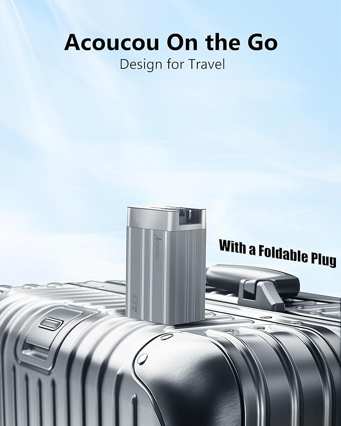 - 【Safe & Reliable】To efficiently dissipate heat, the Acoucou 67/65 watt USB C charger has an independently designed layered cooling structure. The dynamic temperature sensor constantly monitors the temperature in real-time, and the intelligent chip adjusts the power output accordingly,provides protection against overcharging, overvoltage, overcurrent, and overheating, ensuring the safety of both you and your devices during the charging process. Our type c charging block is extremely fast and has been certified by ETL, FCC, and UTL.