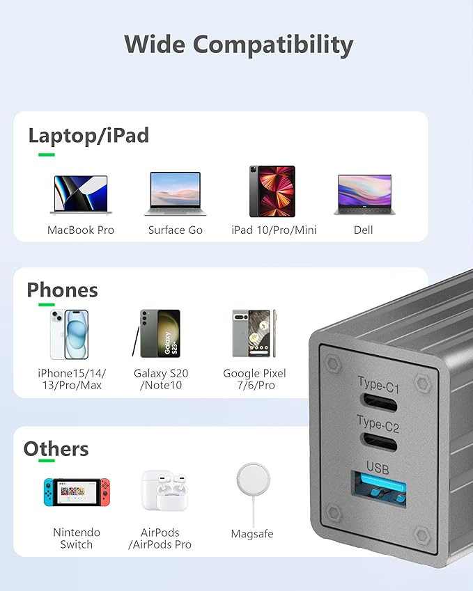 - 【Wide Compatibility】Our USB C fast charger is compatible with all mainstream devices on the market, including but not limited to iPhone/Pro/Max, iPad/Mini/Air/Pro, MacBook/Air/Pro, Samsung Galaxy Ultra/Note, Surface, Galaxy Book, Chromebook, Dell, Lenovo, HP, Asus, LG, Acer, Steam deck and more. As long as your device supports fast charging up to 67W and is equipped with our provided Type-C fast charging cable, you can get an unprecedented charging experience.(Devices for apple require an original USB-C to Lightning cable)
