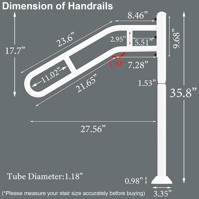 - ๐ฅ OUTDOOR HANDRAIL FOR 1-3 STEPS - Single post square steel tube height 35.8", U-shaped bent stair rail length 32", suitable for 1-3 step stairs. Designed with a 30ยฐ bend slope and 2 non-slip crossbars, the 3.35" x 3.35" base plate to improve stability, it is perfect for helping people keep balance and prevent skidding.