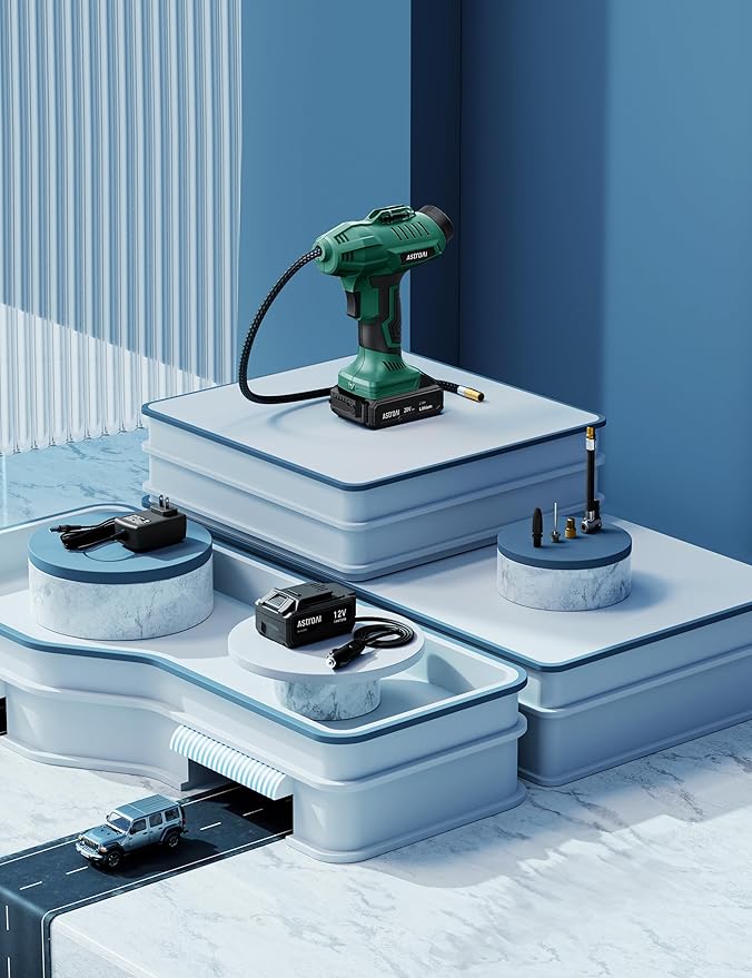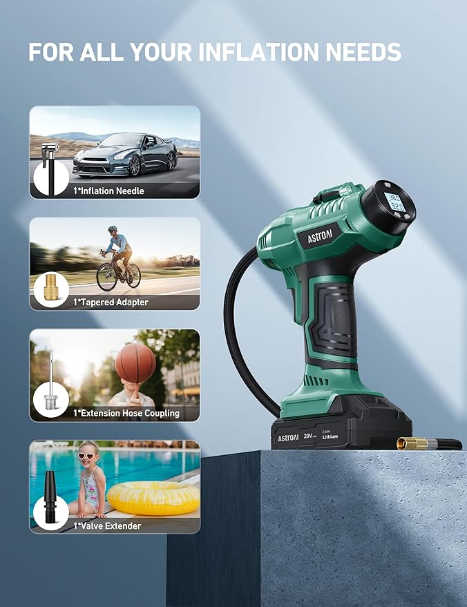 AstroAI C2 Cordless Tire Inflator Air Compressor 20V Rechargeable Battery Powered 160PSI Portable Air Pump with 12V Car Power Adapter Digital Pressure Gauge for Cars Motorcycles JY16P160-18 Green