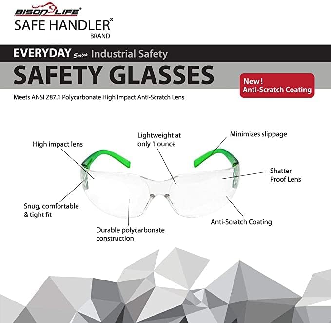BISON LIFE Clear Lens Green Temple Safety Glasses BULK Case Pack 24 Pairs | ANSI Z87, Impact & Scratch Resistant, Clear Safety Glasses for Men and for Women, One Size, Adult, Youth